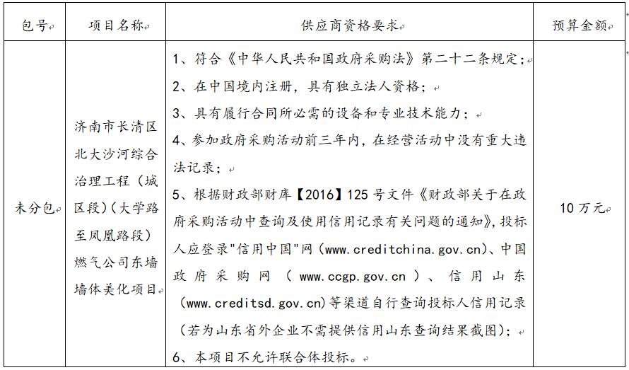 二、采購(gòu)項(xiàng)目名稱:濟(jì)南市長(zhǎng)清區(qū)北大沙河綜合治理工程(城區(qū)段)(大學(xué)路至鳳凰路段)燃?xì)夤緰|墻墻體美化項(xiàng)目