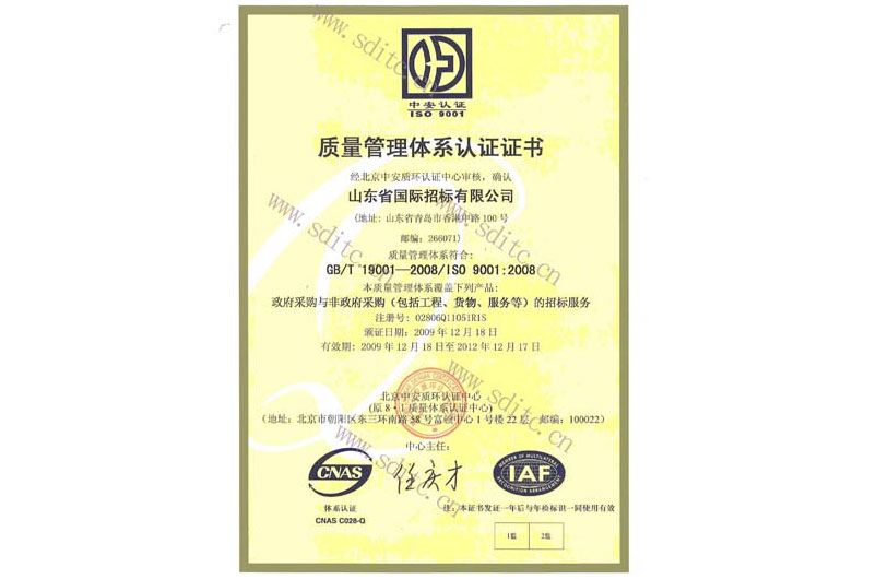 質量管理體系認證證書