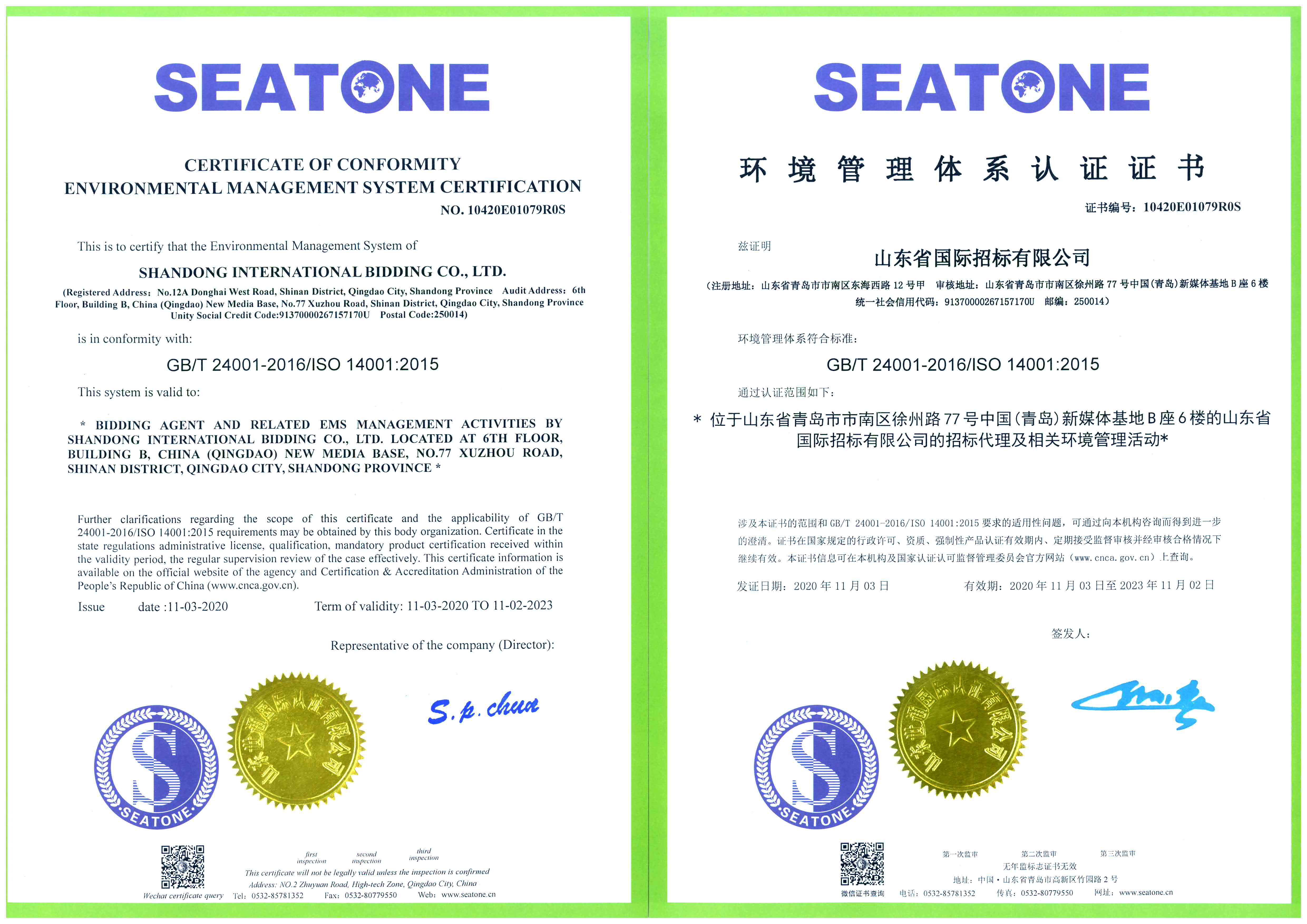 ISO:14001:2015環(huán)境管理體系認證證書