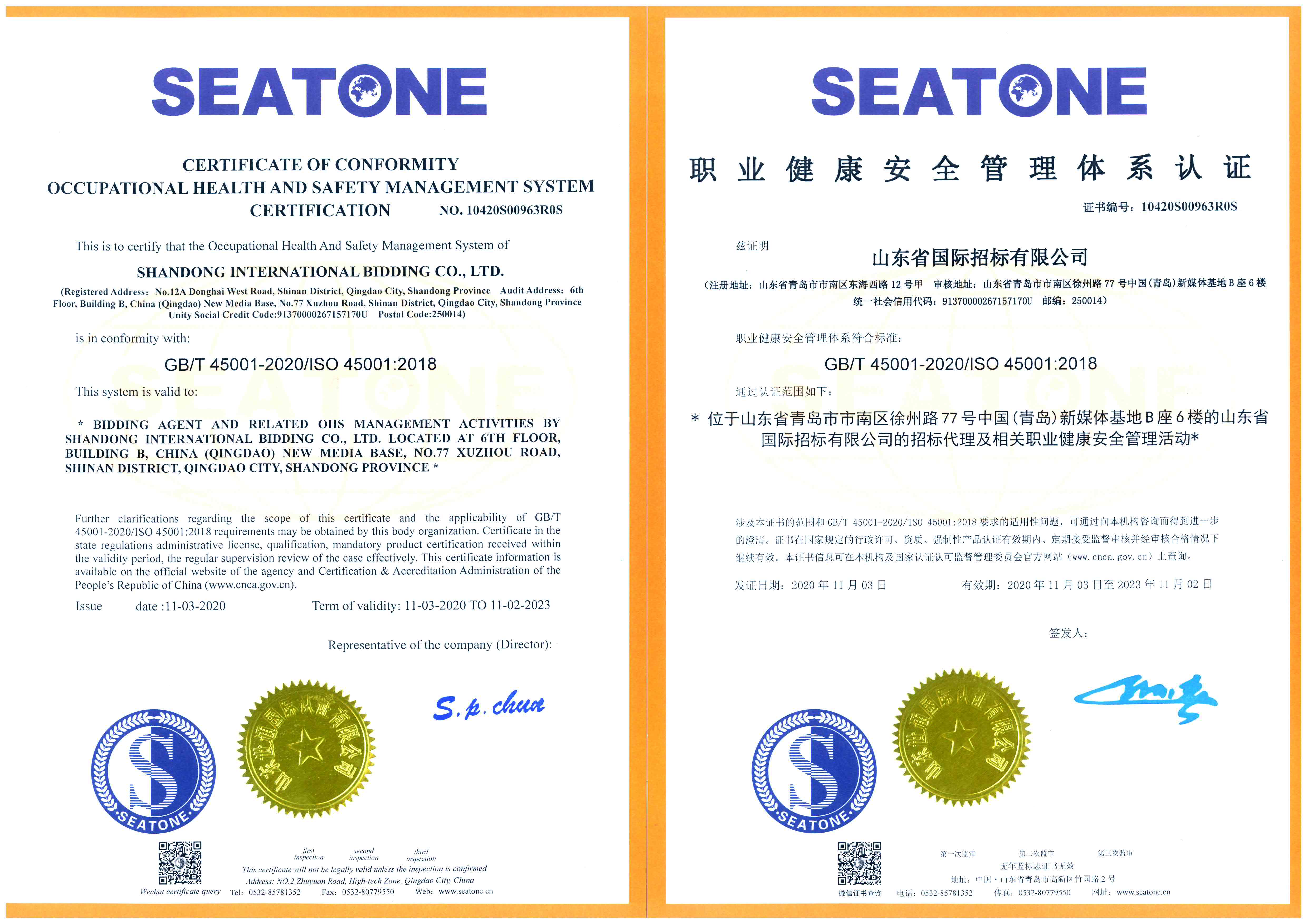 ISO:45001:2018職業(yè)健康安全管理體系認證證書