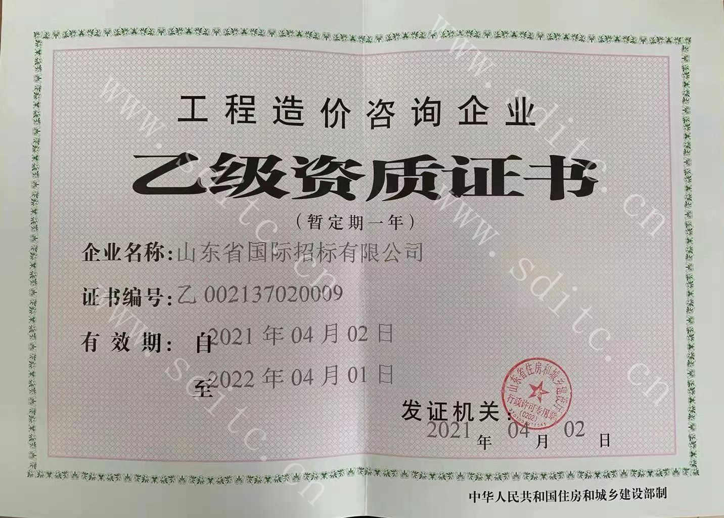 工程造價咨詢企業(yè)乙級資質證書